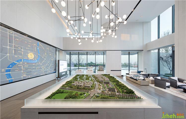 沙盤區(qū)背景墻黑色的幾何體塊與上方的線型燈飾構(gòu)成厚重與輕盈的對比。