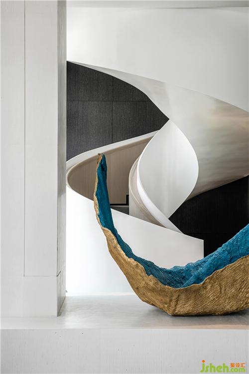 旋轉(zhuǎn)樓梯與藝術(shù)裝置是舞動的“精靈”,造型和線條展現(xiàn)力量與靈動。藝術(shù)品為空間的空白填補想象,在具象與抽象之間,傳遞價值。