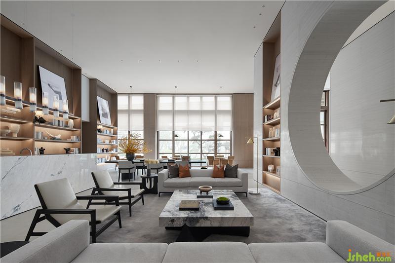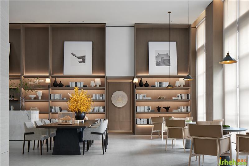 書吧承載著閱讀、交流、休閑的功能。長桌、散座、圍合式沙發(fā)……設計在此構設了多種就座場景,匹配不同人群的多元需求。家具的款式呈現(xiàn)簡單而不失高級的品質感,駝色、白灰、原木與黑色,疊合出不同的色彩層次,盡顯典雅。