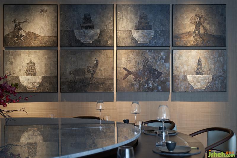 自由是人的天性,也是現(xiàn)代設(shè)計的靈魂。設(shè)計的筆墨自由地穿梭于新舊之間,在宴會廳中以一組現(xiàn)代藝術(shù)家歸榮彪的油畫藝術(shù)《古影似夢》,呈現(xiàn)渭南的皮影文化——懷舊、古樸的色彩,似夢似幻的寫意,斑駁迷離地展示著傳統(tǒng)文化的特殊魅力。新時代的油畫語言,賦予這一古老文化新的解構(gòu)與詮釋,既為空間增添了幾分場域記憶濃度,也引發(fā)觀者的各種冥思和遐想。
