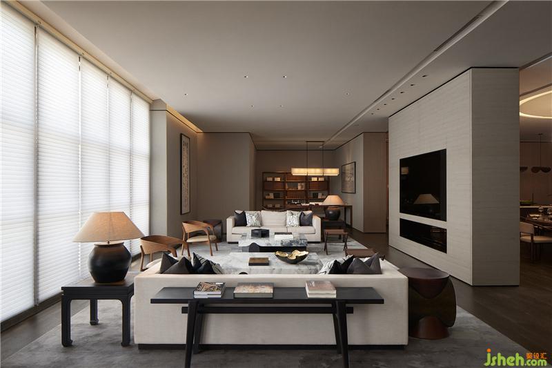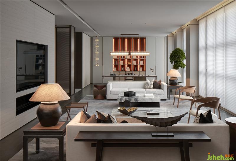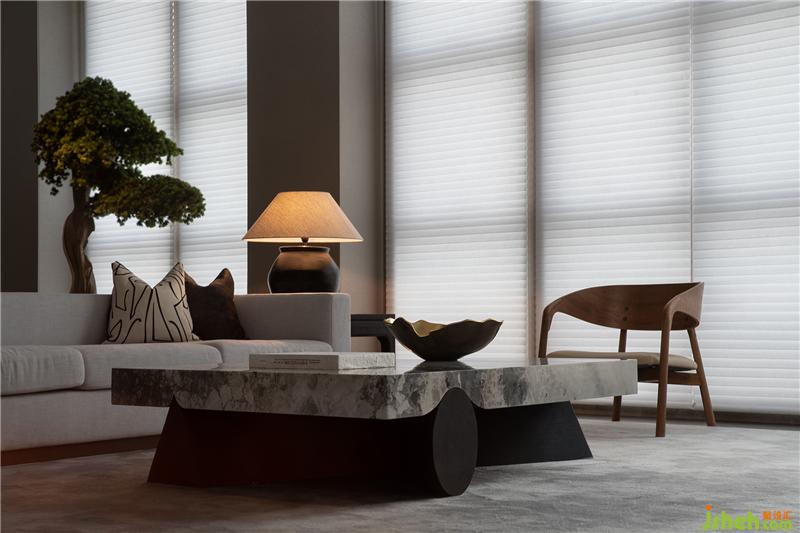 會客區(qū)整體以米白為基調(diào),點(diǎn)綴深淺相搭的原木色澤、氣質(zhì)高雅的大理石桌,對稱掛墻的書法作品與一旁蓬勃蓊郁的古松,為空間添增文人儒雅的氣質(zhì),充分塑造了一個具有格調(diào)與品質(zhì)感的會客空間。