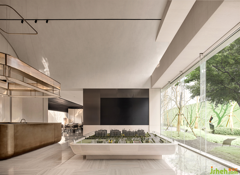 接待廳由兩側(cè)洞口引流,來到主空間,視野頓時變得通透開闊。水吧區(qū)和沙盤區(qū)整合在一條軸線中,兩端為園林景觀,有良好的框景效果。