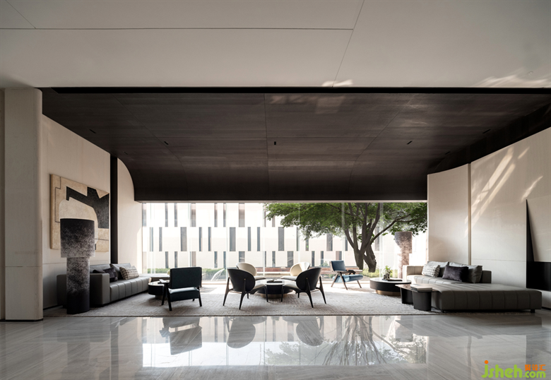 剪水盈波,樹影搖曳,為了讓人們的視線能聚集于身旁的景致,洽談區(qū)的界面設計暗藏了巧思。