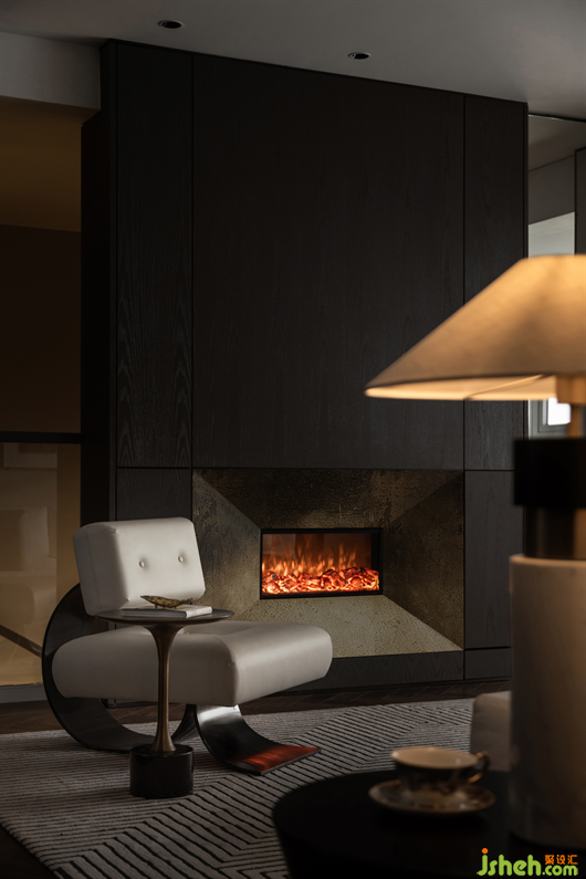 △木飾面營(yíng)造的舒適愜意之外,拉絲古銅、皮革、大理石也很好地點(diǎn)綴出了一種海派的精致感;體塊鮮明的素色墻面兼顧了影視廳背景墻的功能,并以弧線切分嵌入一架壁爐,點(diǎn)染冬日的陣陣暖意。