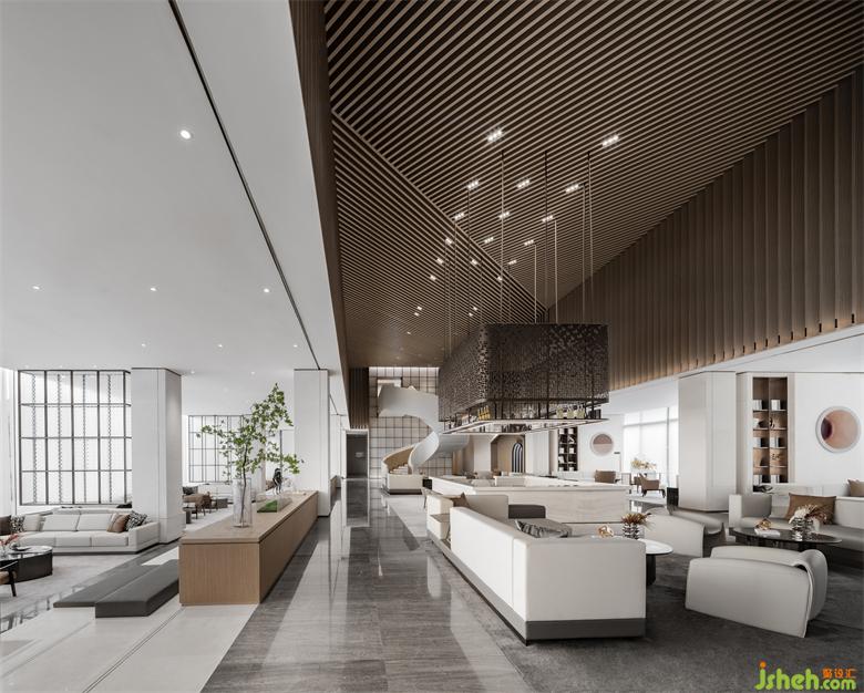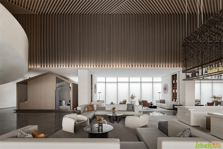 公共洽談區(qū)頂部造型設計靈感源于沈陽中國工業(yè)博物館的外立面,博物館建筑以鋼鐵等金屬材料塑造硬朗大氣的外觀,我們將建筑造型的特色提煉為室內設計的語匯,營銷中心設計使用溫潤的木材朝不同角度有序列的順延,生成有強烈造型感的空間結構。在視覺上更為簡約大方,且增強了與人的親近感。