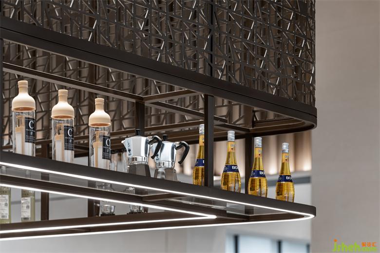 中間的水吧采用了有做舊質(zhì)感的金屬,鏤空的雕刻造型富有工業(yè)美感。與天花的造型相融,能直觀感受到日新月異的材料和工藝的變化。