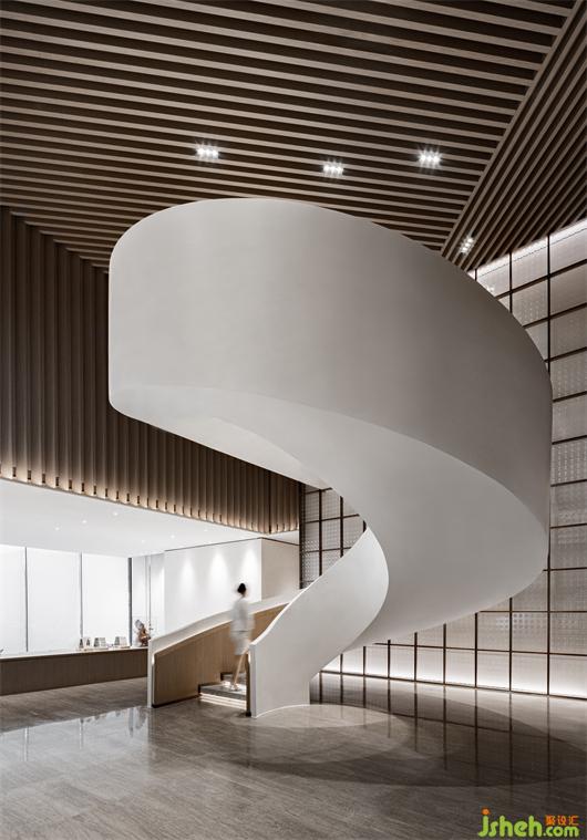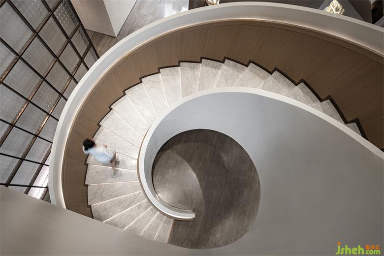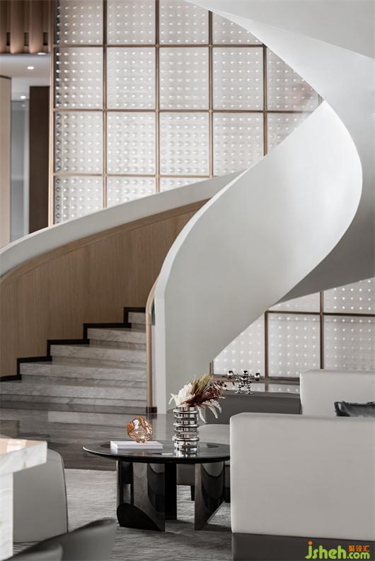 一部白色螺旋樓梯占據(jù)中廳核心,如同雕塑般矚目,營(yíng)銷(xiāo)中心設(shè)計(jì)徹底打破了方形格局,成為空間中生動(dòng)的立體主義藝術(shù)。螺旋樓梯有力且柔美,無(wú)論自上而下還是自下而上都能感受到幾何美學(xué)和流線韻律。