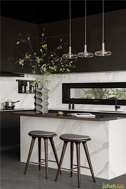 在容易受人忽視的廚房,別墅設計也不遺余力去提升使用品質(zhì)與空間質(zhì)量。備料區(qū)的立面巧妙地增加了一條水平條窗,里外可以視野相對,空氣流通,自由交流。廚房再也不是一個斷絕交流的封閉場所,或?qū)⒊蔀榧彝テ錁啡谌诘纳缃粓龅亍?