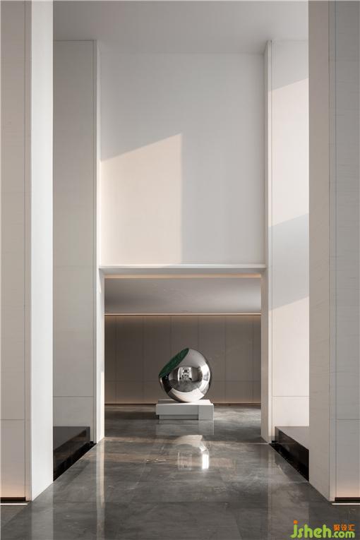 建筑是悠長蜿蜒的弧形動(dòng)線,室內(nèi)廊道如同一幅靜靜攤開待閱的長卷。營銷中心設(shè)計(jì)師引用經(jīng)典的中軸對(duì)稱,一張一合,一進(jìn)一景的鋪陳手法,去創(chuàng)造高低錯(cuò)落的節(jié)奏和空間序列。