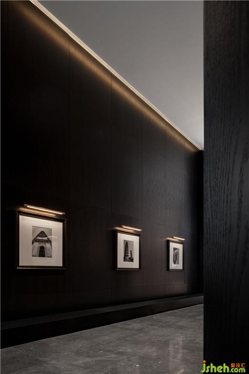 越過(guò)沙盤(pán)深入中庭,需經(jīng)過(guò)一段悠長(zhǎng)的走廊。營(yíng)銷(xiāo)中心設(shè)計(jì)師有意在此降低明度,以深色的界面包裹空間,深邃、肅穆……心理感受產(chǎn)生變化。裝點(diǎn)于墻上的黑白古建筑攝影作,增強(qiáng)了室內(nèi)的藝術(shù)內(nèi)涵與氣息。人們?cè)谛羞M(jìn)的過(guò)程中可一覽太原古城的魅力與豐贍。