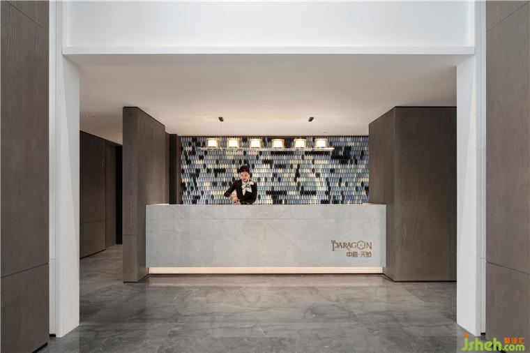 當(dāng)代藝術(shù)品更多地在追求造型的簡化,轉(zhuǎn)而注重向內(nèi)的思考。由2800片陶瓷片構(gòu)成的水吧臺背景墻,營銷中心設(shè)計吸取了琉璃的部分制作工藝,經(jīng)歷成型、素?zé)?、施釉、釉燒終成絢麗效果。