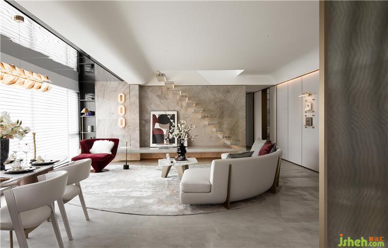 躍層戶型的難點之一是樓梯的設計。我們將樓梯放在了客廳背景墻的位置,盡可能地少占用面積,樣板房設計不阻礙空間功能區(qū)的完整性,令到客餐廳有連貫的寬裕尺度。樓梯間接成為了室內(nèi)視野的焦點處,因此其造型設計至關重要。
