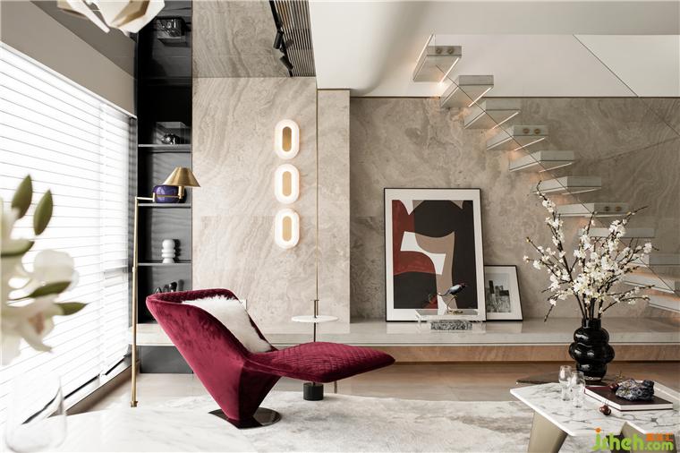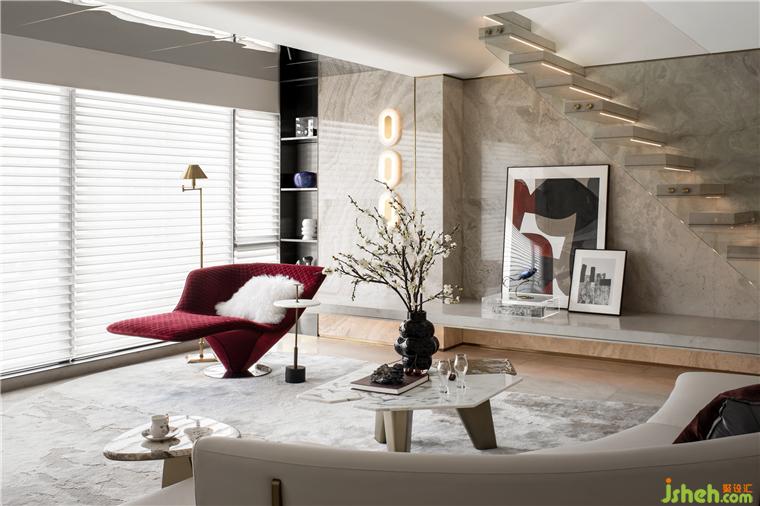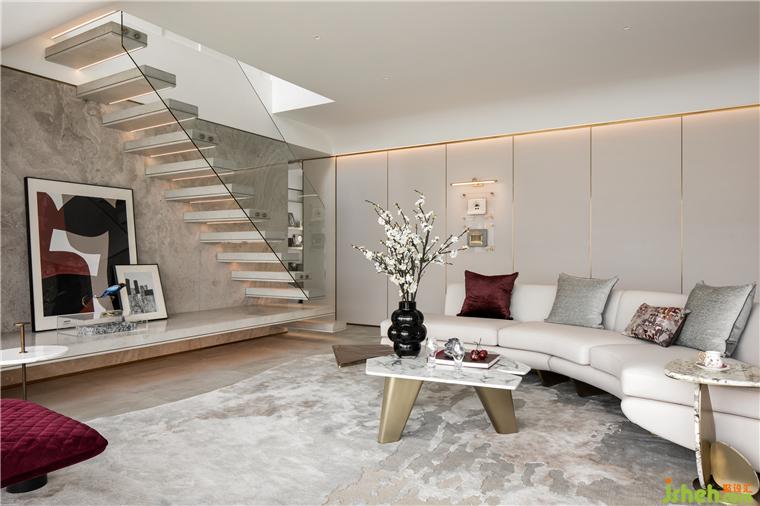 隱形的超白玻欄桿,石材作為踏步,直接展示了梯步的材料和形狀,樣板房設計具有輕奢感的樓梯成為空間的立體“雕塑”。