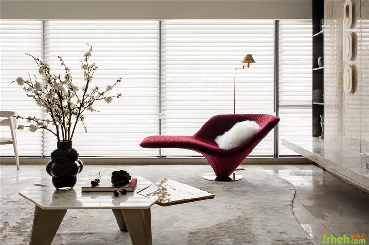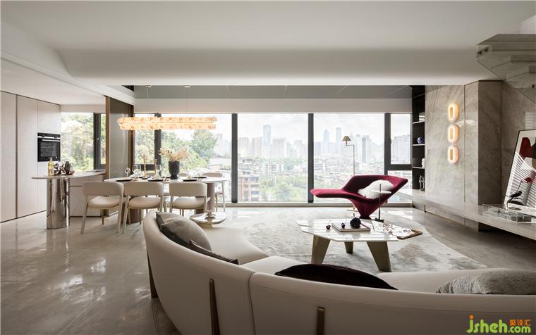 大橫廳全落地窗盡攬室外風景。沙發(fā)的造型及擺放方式是靈活且具有趣味感的,配合一張圓形地毯更增添了空間的圓潤度、輕盈感。