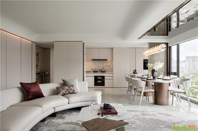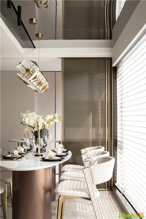樣板房設計在結構梁較低的一側,采用了鏡面不銹鋼包裹整個天花,擴大空間視覺。整體采用無主燈設計,空間自上而下流暢一體,