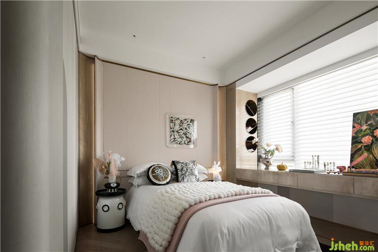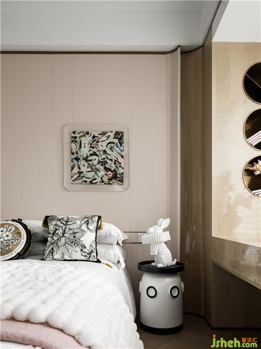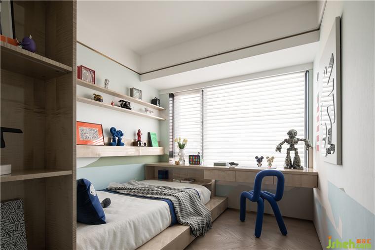 樣板房設計師將兩個兒童房設計為聯(lián)動型的套房,利用一部分過道空間設計為大面的儲物柜,補充了兒童房內收納不足的缺陷。內部的衛(wèi)生間以三分式設計方便家人的使用。