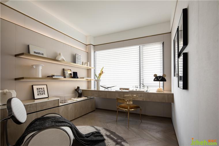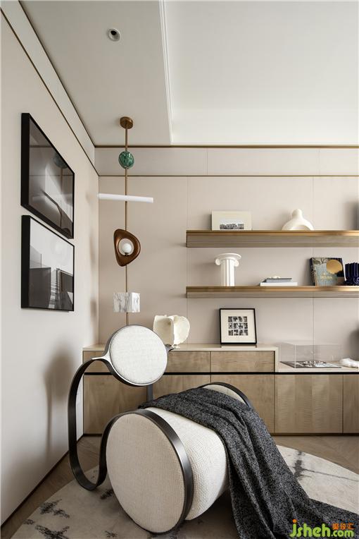 另一個可靈活改動的房間設計為獨立的書房,布局和陳列以簡約實用為主,開放式展架便于拿取,樣板房設計采用淺色調及木質材料,利于建立一個安靜的習作環(huán)境。