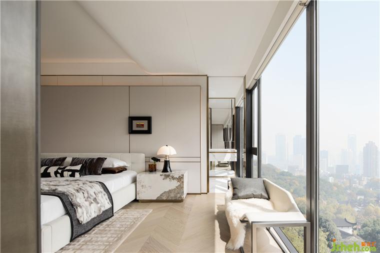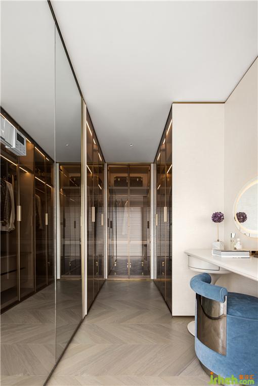 一側(cè)全景落地窗,擴(kuò)展了尺度感。樣板房設(shè)計(jì)獨(dú)立的衣帽梳妝間,精細(xì)完整的收納系統(tǒng)令生活更加充盈從容。