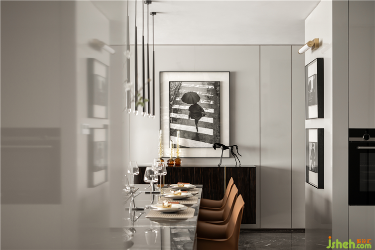 大理石餐桌搭配皮質(zhì)餐椅體現(xiàn)空間的品質(zhì)感,再搭配裝飾吊燈,增加空間的品質(zhì)感。