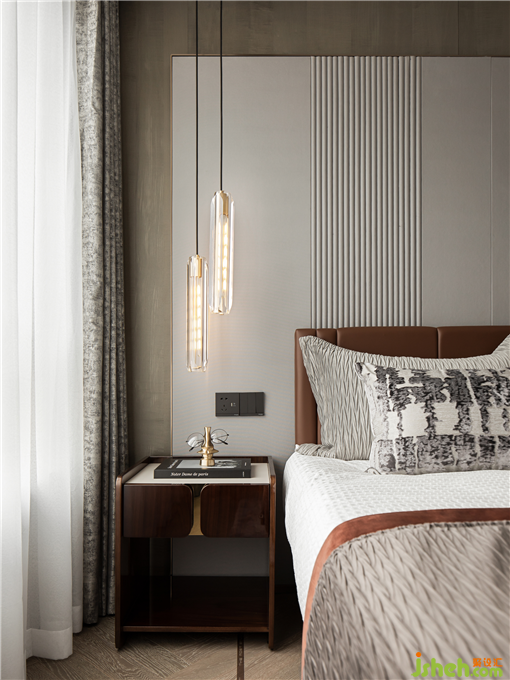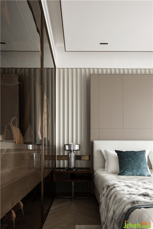 樣板房設(shè)計主臥套房內(nèi)設(shè)起居室、衣帽間、梳妝臺和主衛(wèi),各功能區(qū)呈遞進式布局。在氛圍上,營造時尚而不浮躁,典雅卻不乏溫馨的感覺。