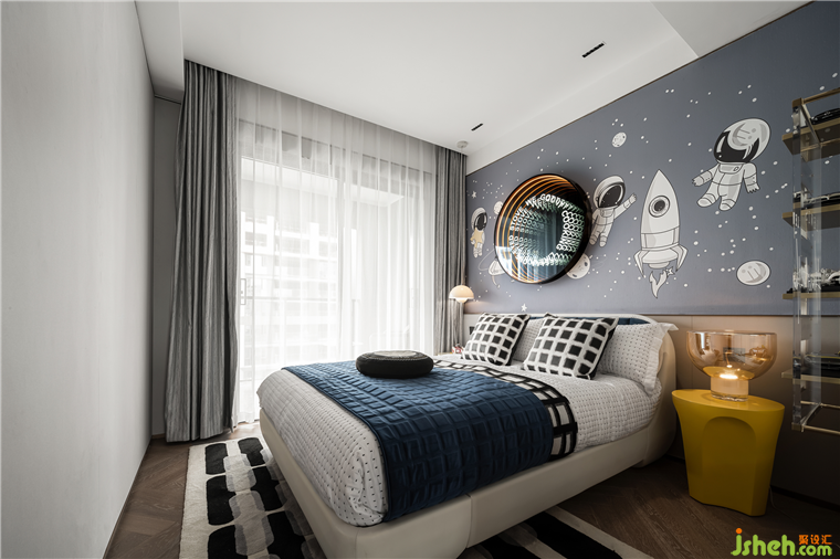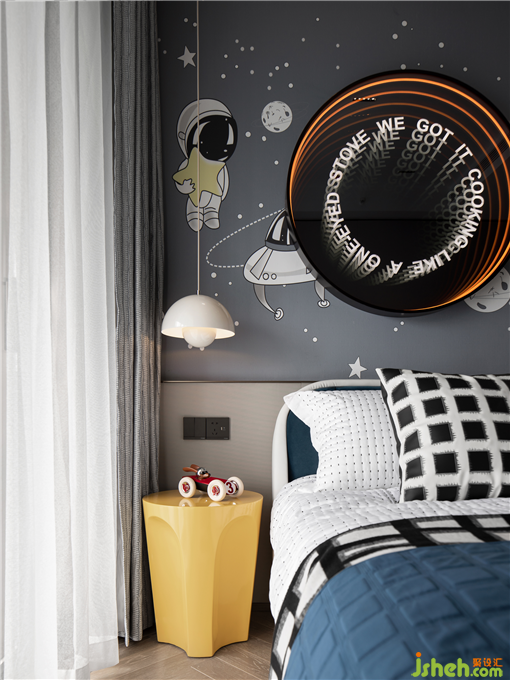 兒童房以“星際漫游”為主題,搭配跳脫的黃和藍,以及收集的系列手伴,讓兒童房充滿童趣,培育孩子的好奇心與探索欲。
