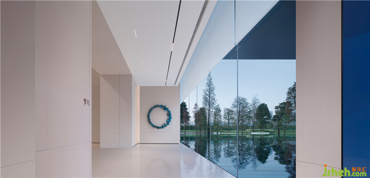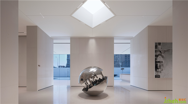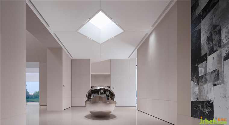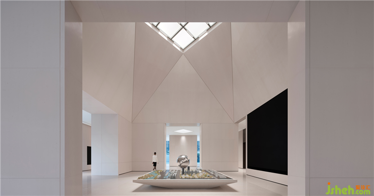 順德悅府示范區(qū)設(shè)計從主入口第一進開始分成兩條流線,第二進再以藝術(shù)過廳過渡,分流至品牌館和沙盤區(qū),形成“兩廊”式的連接各區(qū)域的過渡作用。