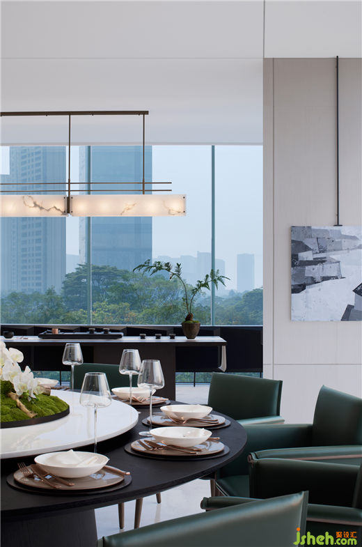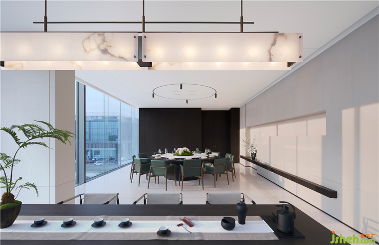私宴廳,空間一如既往的純凈與通透。光線透過玻璃幕墻與室內(nèi)材質(zhì)與織物展現(xiàn)出光影的魅力。柔和的色調(diào)延伸光的介質(zhì),提升整體的簡潔與雅致。
