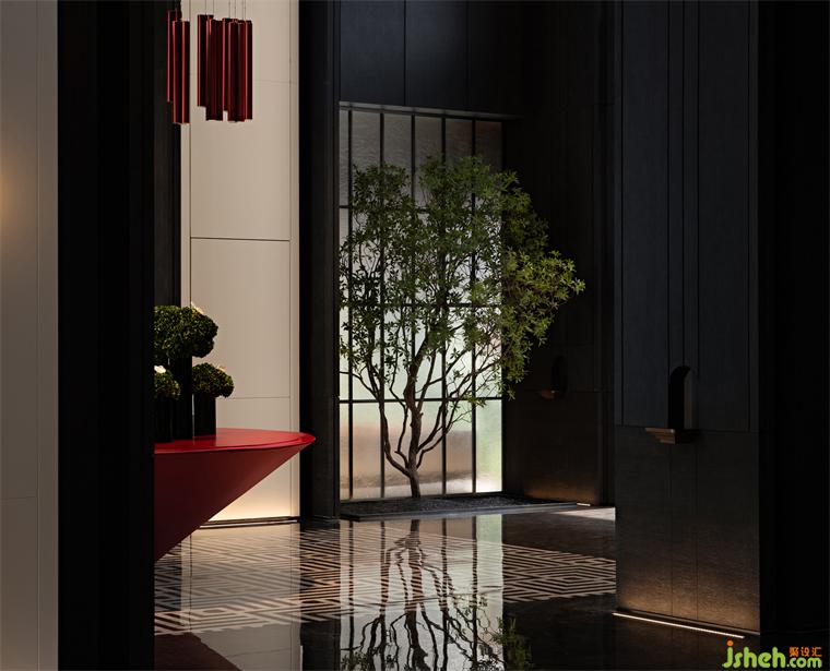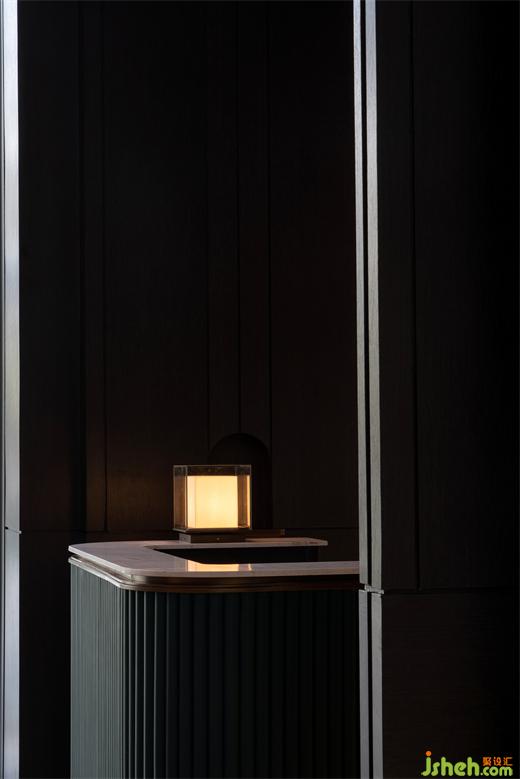 具有雕塑感的端景臺,其經(jīng)典的幾何輪廓感,亮眼的紅色漆面,賦予空間時尚典雅,在硬裝深色基底,現(xiàn)代簡潔的襯托下,形成強(qiáng)烈的視覺張力。