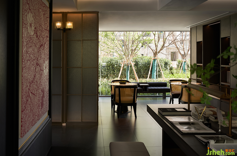 深色的木飾面與玻璃屏風(fēng)的結(jié)合,木作與啞光金屬的銜接,豐富材質(zhì)的觸感,溫馨的燈光照映下,會(huì)所設(shè)計(jì)整體的材質(zhì)色彩搭配,令空間底色是如此地靜雅。