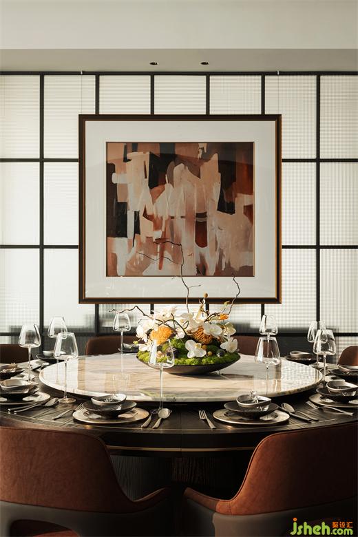 玻璃屏風(fēng)虛實(shí)結(jié)合,為會客廳增添一定的私密感和秩序感,構(gòu)成對稱均衡的空間比例。