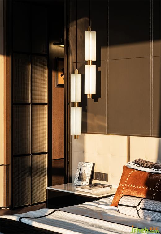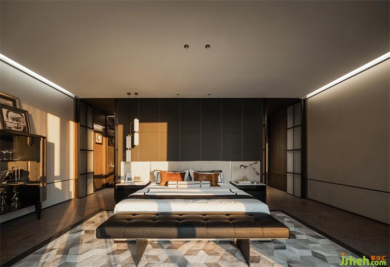 樣板房設(shè)計(jì)利用奢闊的尺度將臥室布局為三段遞進(jìn)式的分區(qū),床對景而立居中擺放,與衣帽間形成洄游動線。