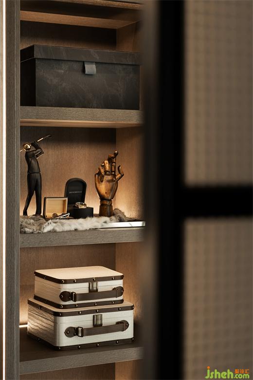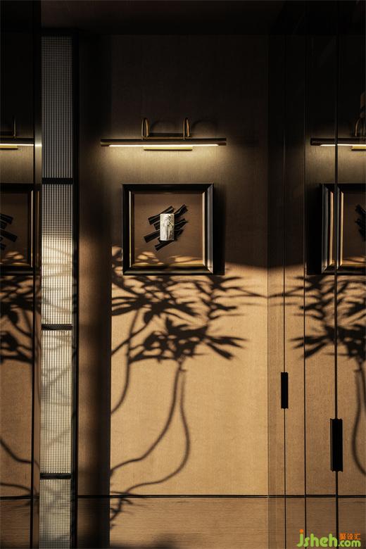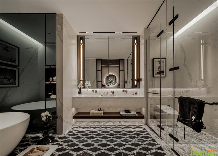 四分離衛(wèi)生間,金屬與石材的穿插,比例分配恰到好處。樣板房設(shè)計幾何拼花序列之美,在燈光的渲染下,塑造三維的視覺效果。