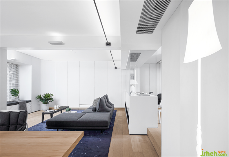 客廳有一處高位, 設(shè)計師巧妙地在高低位銜接處做了一個多功能的書桌,小朋友可以坐在上面看書、玩樂高,同時還能與坐在沙發(fā)上的父母對視、交流.