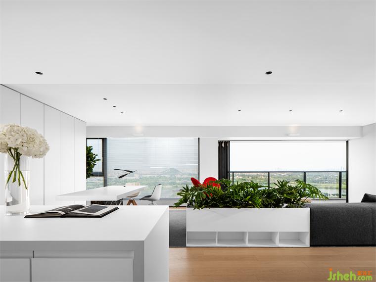 沉穩(wěn)色調(diào)的布藝沙發(fā)中點(diǎn)綴著些許綠植,綠植柜體下方帶有一排鏤空書柜,江景大平層設(shè)計容置綠植的同時,還可放置繪本和玩具。當(dāng)母親在餐吧上忙碌時,可以看到坐在木地板上的小朋友看書玩耍的溫馨場景。
