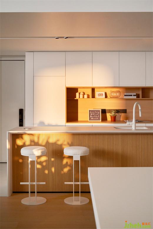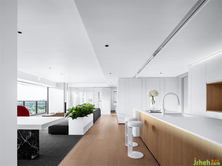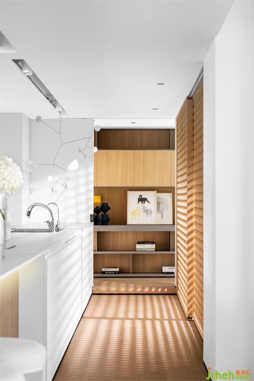 餐吧表面的飾面材質(zhì)有著溫潤樸實的質(zhì)感,在頂部燈光的映射下,材質(zhì)、色彩與光影交織融匯成一曲優(yōu)雅的韻律。餐吧的底座由天然大理石構(gòu)筑而成,天然雕飾的紋理通達(dá)自然,流露出晶瑩清冽的質(zhì)感。江景大平層設(shè)計陽光從百葉窗的縫隙溜走,藝術(shù)裝置《竹蜻蜓》在微風(fēng)中搖曳,一動一靜,蕩漾著盎然的生命力。