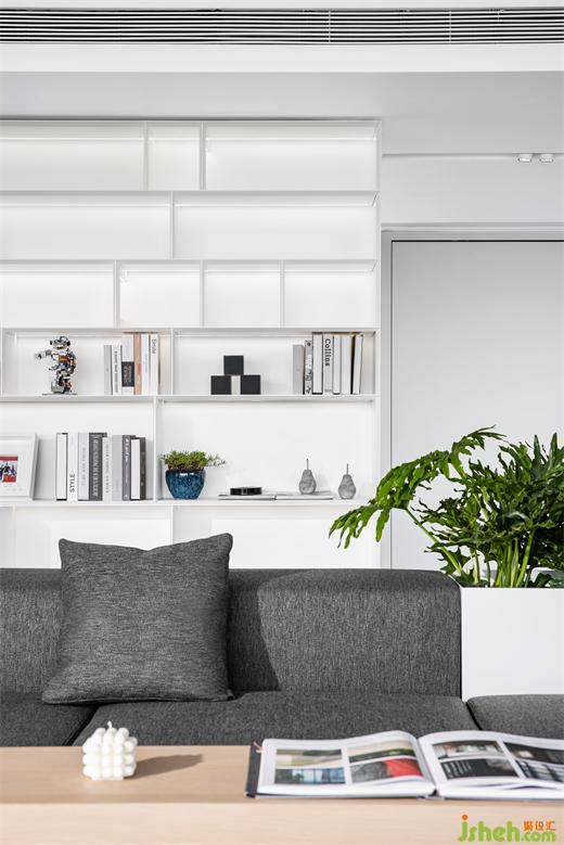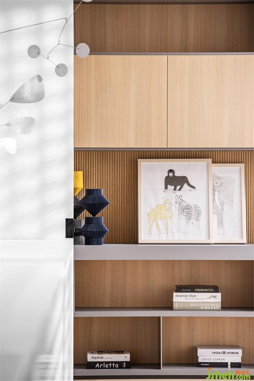 純白,予人干凈、溫馨之感,純白也給了現(xiàn)代家居設(shè)計更多想象的空間。在沙發(fā)后部的墻體上布置了一面純白色書柜,簡約的線條搭配別出心裁的燈光設(shè)計,體現(xiàn)出簡潔而豐富的藝術(shù)趣味。底部加設(shè)了置物柜體,江景大平層設(shè)計小朋友可以踩上柜體拿到高處的書,細(xì)節(jié)滿滿的設(shè)計,極大地增加了美好空間人居體驗。實木的柜體上亦擺放著童趣擺件及香薰蠟燭,為整個清新淡雅的空間增添了獨(dú)特而有趣的微妙變化。