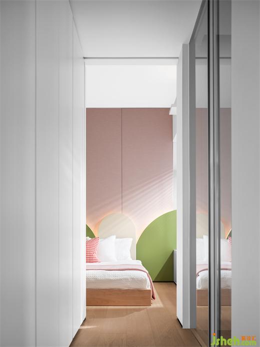 兒童房整體色彩濃郁飽滿,嫩綠的床頭背景墻帶有滿滿的春日氣息,江景大平層設(shè)計背部的燈光更增添了幾分溫暖而純粹的氣息。小朋友可以在空間內(nèi)呈回字形自由跑動,臥室與書房之間的柜體安裝了趟門,賦予空間以靈動感和更多的可能性。