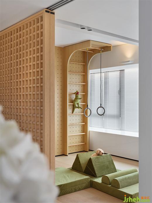 多功能區(qū)布置了一面到頂?shù)呐蕩r墻,五彩的攀巖石和草綠色的壁板相映成趣。另一側(cè)墻壁則布置了白色柜體和草綠色展示柜,與墻體、坐墊的顏色相互呼應(yīng)。