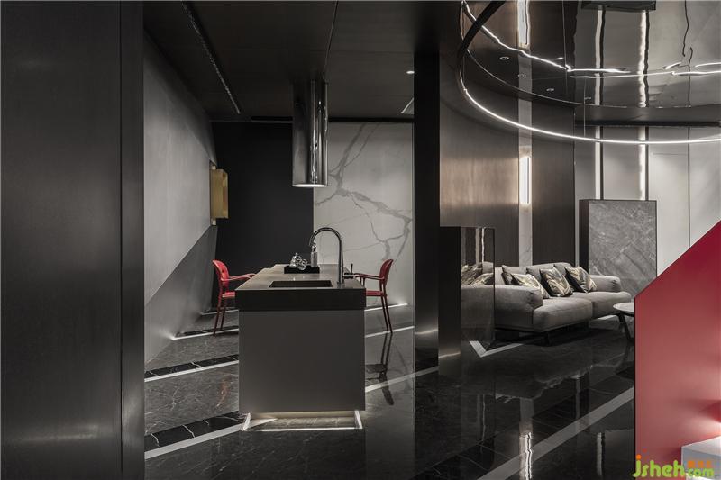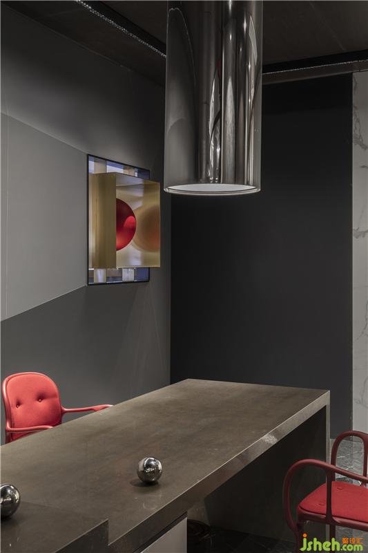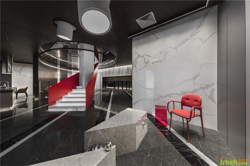 展廳中心的樓梯以匯聚的塊面和鮮紅的顏色宣泄出空間獨特且富于張力的情緒,有著當(dāng)代藝術(shù)的特色并積極調(diào)動參觀者的感官。在“拉伸”的空間中,開闊性和層次感都得以強調(diào)。裝修公司