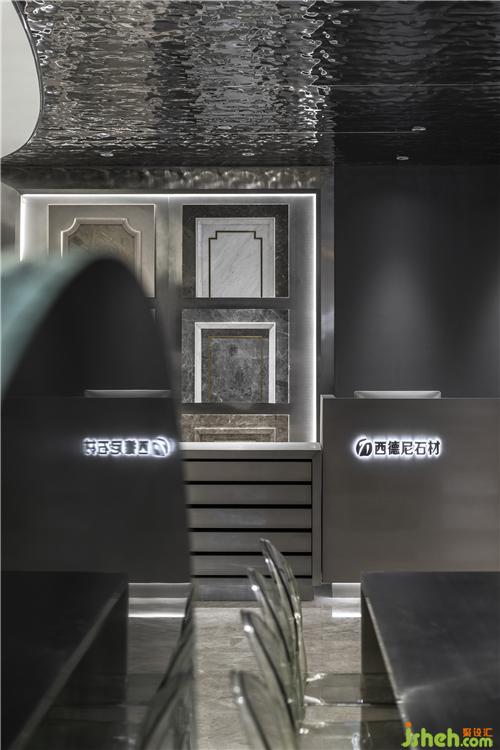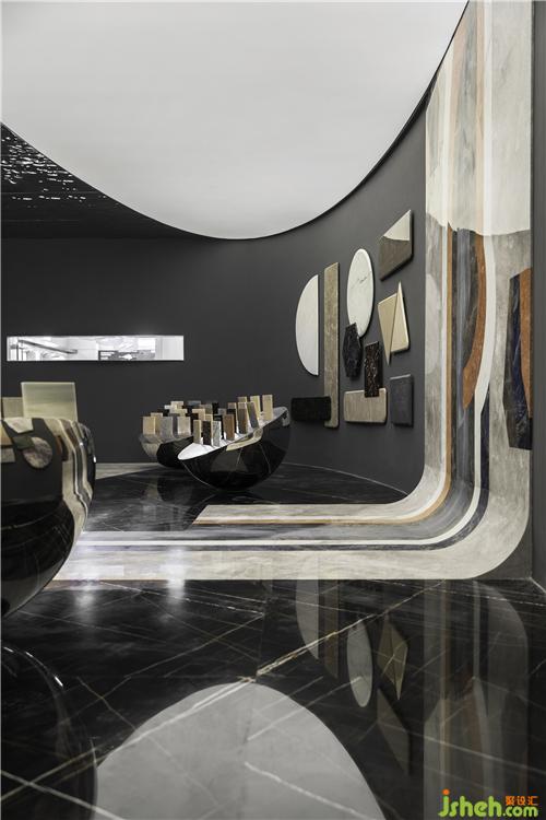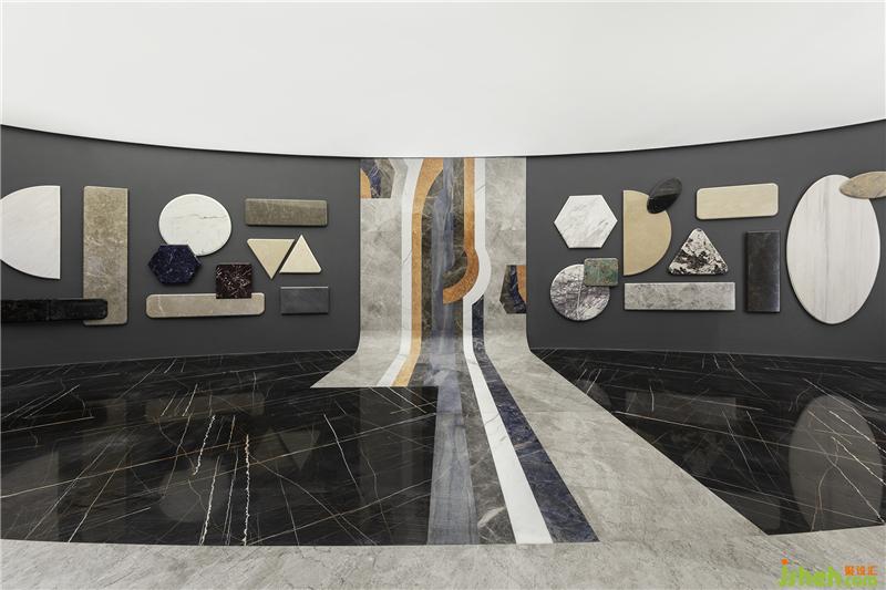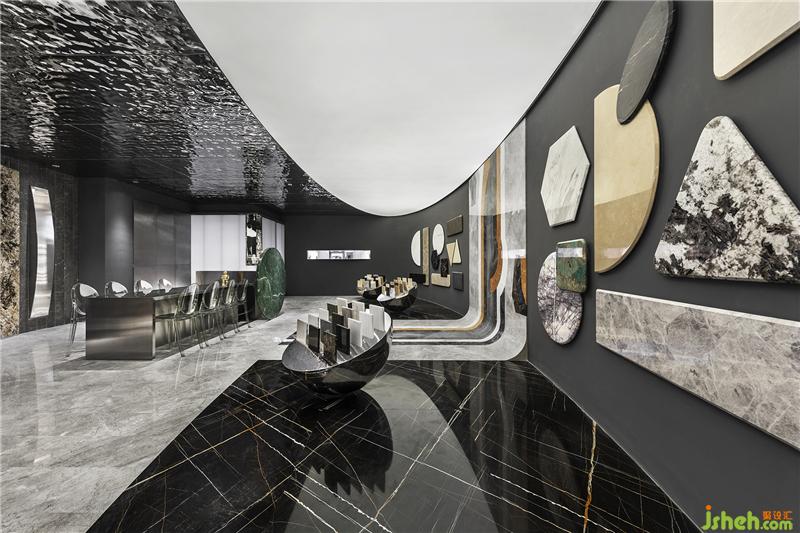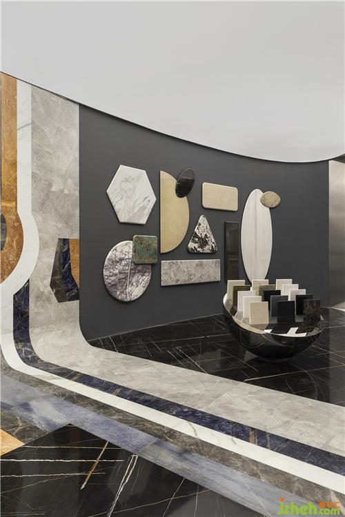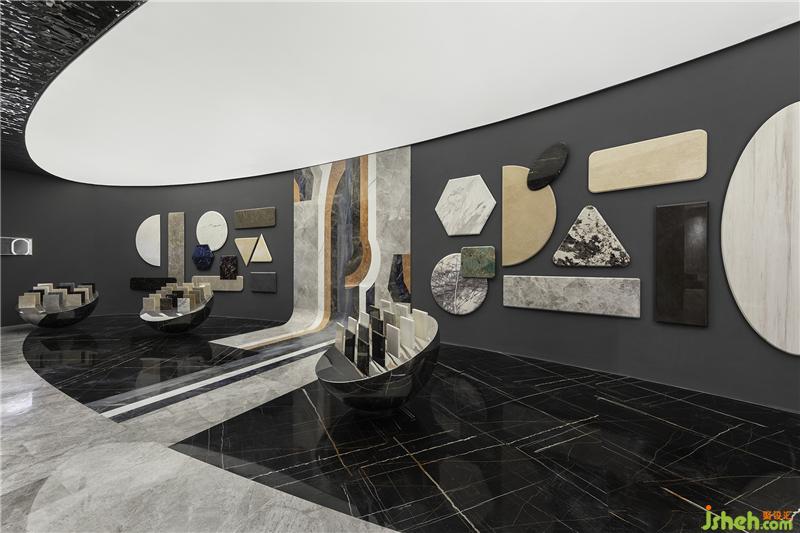 設(shè)計(jì)采用了較多的象征性分割,劃分不同功能分區(qū)的同時(shí)保持著空間的開闊性。錯(cuò)落的高差結(jié)合燈光、家具設(shè)置,使領(lǐng)域變得明確;抽象、概括的幾何形界面因此被自然而然地突顯出來。特意打破傳統(tǒng)石材展示標(biāo)準(zhǔn)的石樣尺寸,采用不同形狀且大小迥異的石材錯(cuò)落分布,營造視覺上的疏密、聚散變化。 展廳設(shè)計(jì)