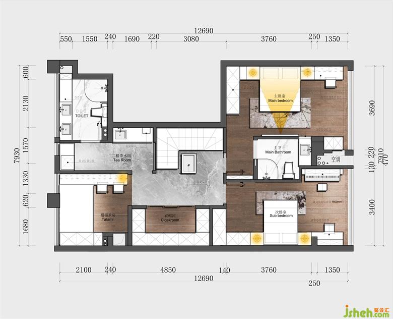 改造后,利用戶型結構將中間光線較差部分作為樓梯間與公共衣帽間,室內設計師這兩個功能區(qū)域對光線要求不高,設計安排在這里彌補了光線的劣勢。同時,在保留兩房的基礎上,新設計增加了一間房間,滿足了三房需求。