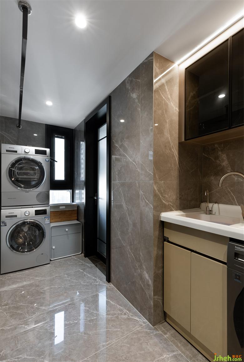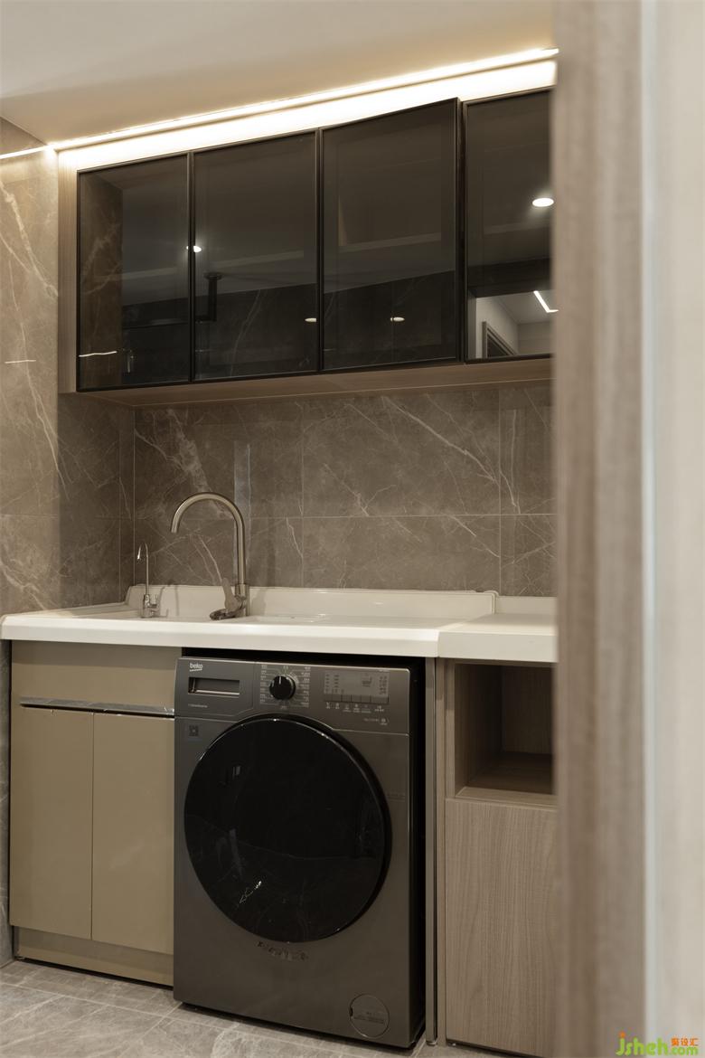 二樓家政間洗衣池,在公衛(wèi)外另外設(shè)置的洗衣機(jī)烘干機(jī),總計(jì)三臺(tái)清洗設(shè)備,很好滿足住戶的清潔需求且通過(guò)對(duì)過(guò)道的利用,一樓的生活陽(yáng)臺(tái)能夠騰出空間,實(shí)現(xiàn)餐廚一體的應(yīng)用。室內(nèi)設(shè)計(jì)師