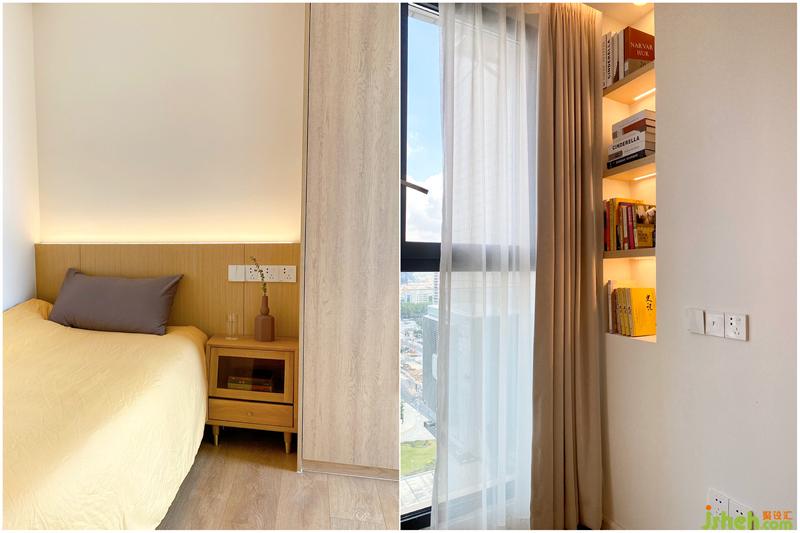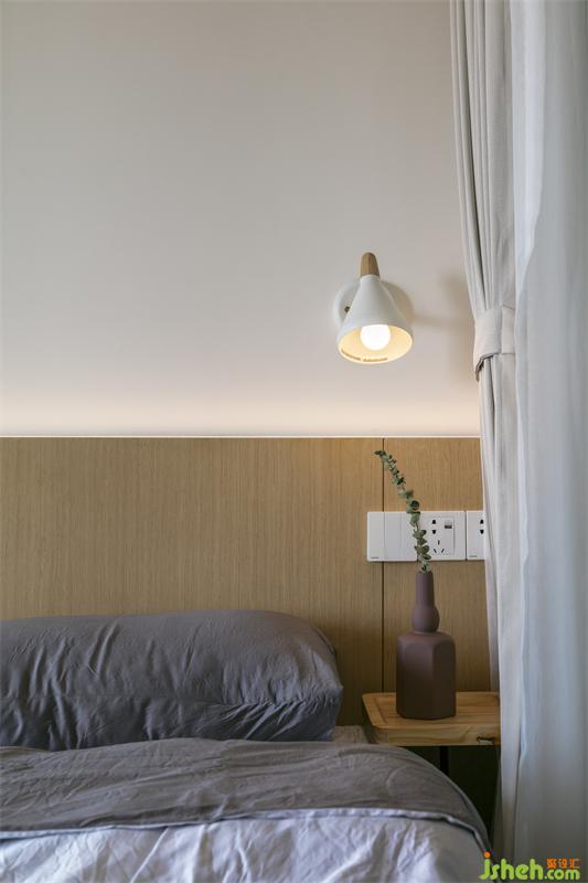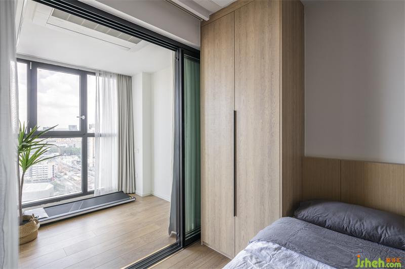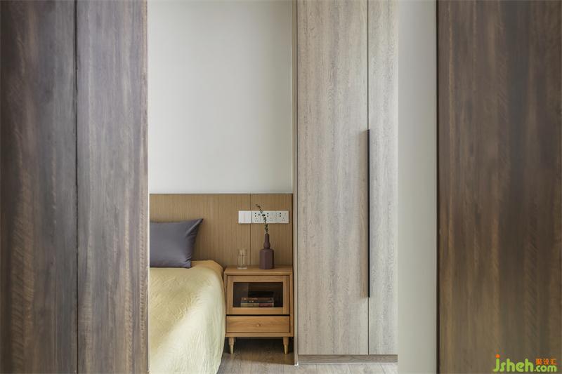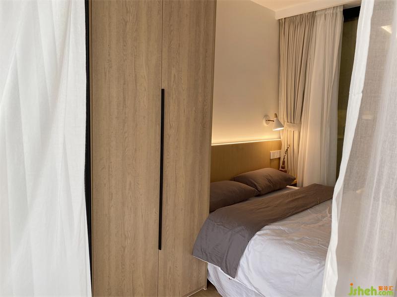 次臥做了一體化的床頭,寬1000mm,由于作息時間不同,S姐姐夫妻是一人一間臥室,次臥平時是她先生住。家居設(shè)計門口的過道定制了雙向開門的柜子,里面開始到頂衣柜,過道開是到頂?shù)膬ξ锕瘛?