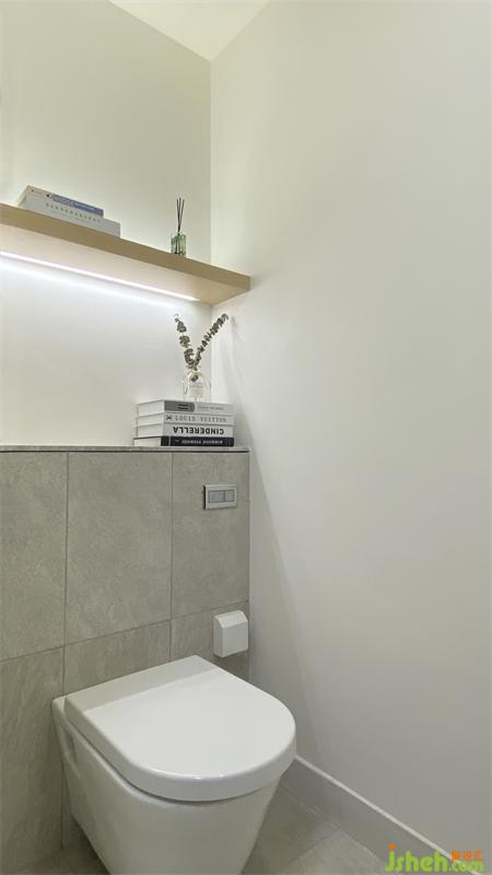 家居設(shè)計(jì)利用抬高的改管技術(shù),實(shí)現(xiàn)了S姐姐雙馬桶間的需求,隱藏式的水箱預(yù)裝完后鋪貼了灰色的瓷磚,與地面形成呼應(yīng),水箱上面用原木色層板點(diǎn)綴空間,增加層次感。