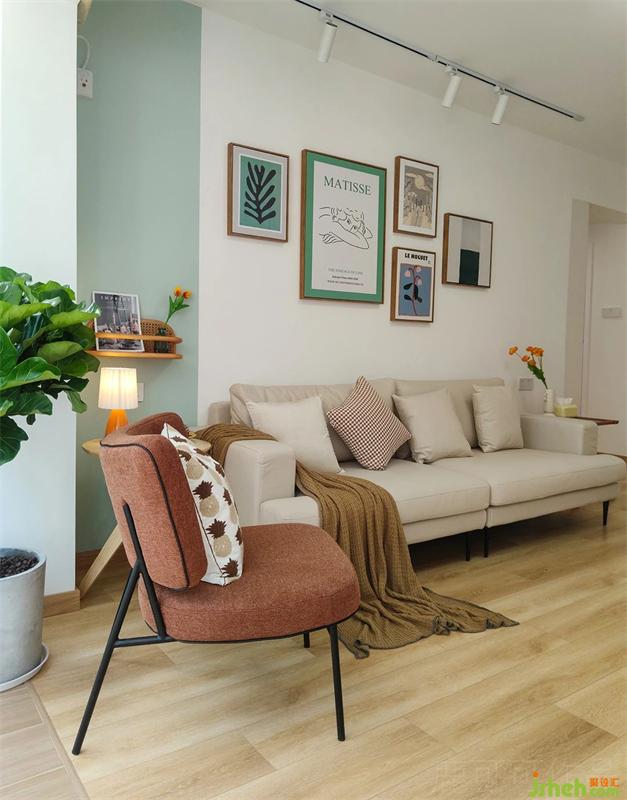 左面的背景墻留了一抹薄荷綠,與馬蒂斯這幅畫的留白綠框相呼應(yīng),搭配了蜜糖紅的單人位沙發(fā),使清爽的客廳增添了一份活潑的氛圍。