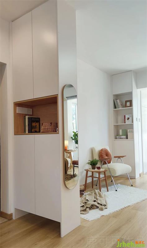 原戶型是沒有玄關(guān)的,在進(jìn)門的位置設(shè)計(jì)了鞋柜,像屏風(fēng)一樣,開門時(shí)(外賣,快遞)可遮擋外人的視線。