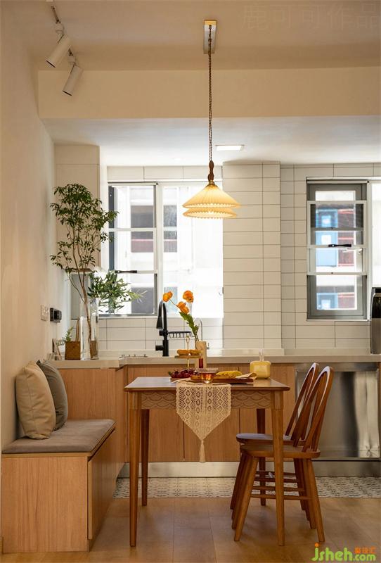 餐廳定做了卡座,地柜可增加收納,固定的坐位不需要給餐椅留位置,更省空間,日常可以滿足六人用餐。