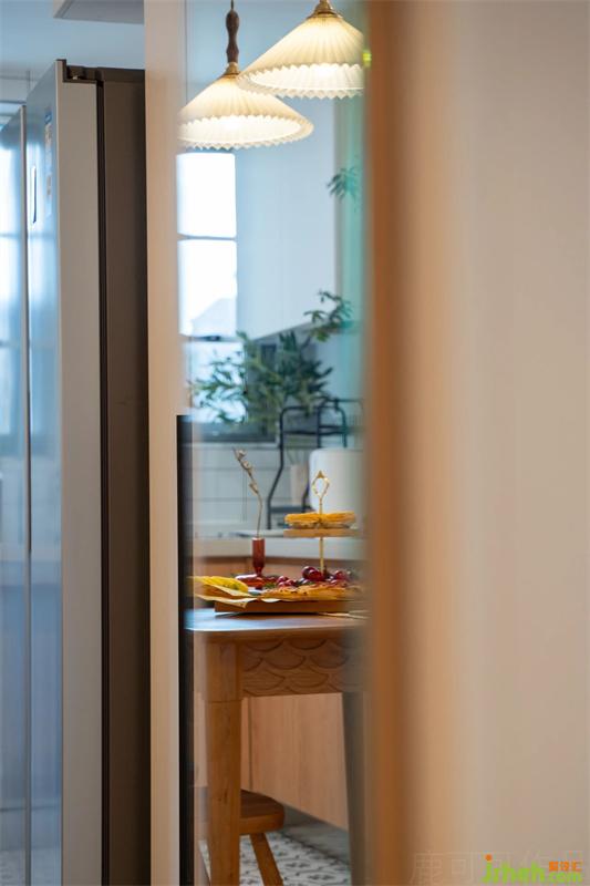 餐桌旁邊是結(jié)合櫥柜一起定制的餐邊柜,放置一些用餐時(shí)使用頻率高的物品,這款餐桌是帶抽屜的,抽屜底下設(shè)計(jì)了一個(gè)長(zhǎng)條形的槽,可以直接放置紙巾,很方便,不用占用餐桌的桌面。