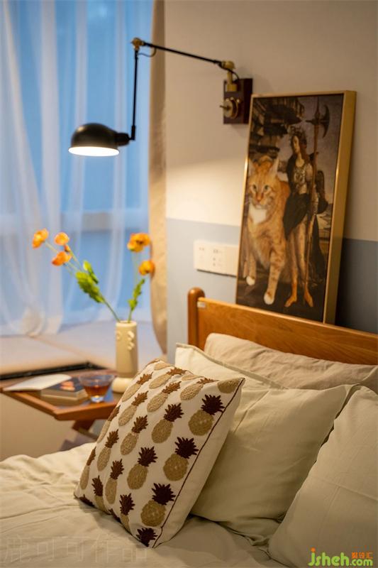 清爽混搭復(fù)古調(diào)調(diào)的臥室,背景是用莫蘭迪甘藍(lán)色做了半墻分色設(shè)計(jì),櫻桃木的家具與背景墻的撞色使空間的氛圍變的很特別,溫柔中夾雜著一絲冷靜,拍攝時(shí)是傍晚,透著藍(lán)光的白色薄紗簾很有油畫的質(zhì)感。
