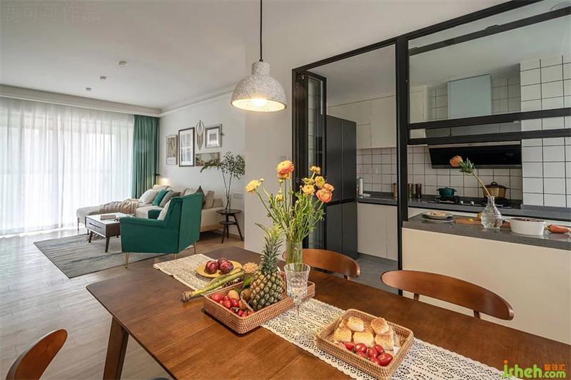 餐廳的餐桌是溫潤(rùn)的胡桃木材質(zhì),可伸縮,根據(jù)就餐人數(shù)自由調(diào)整??ㄗ洗钆涞拇昂熍c客廳的是一致的,前后呼應(yīng)。餐廳看向廚房,家人下廚的身影,日常的對(duì)話,都是生活點(diǎn)滴中的幸福。